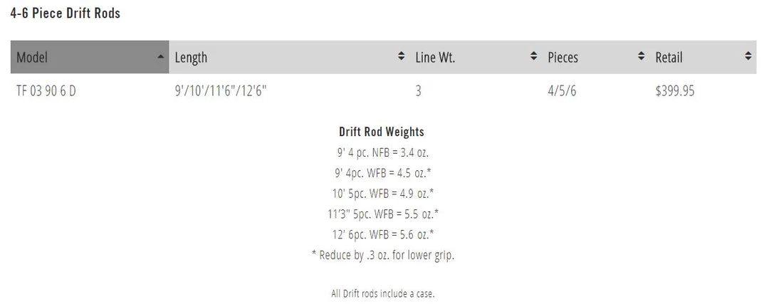 | Rod | 3wt 9'/10'/11'6"/12'6" 4/5/6pc |